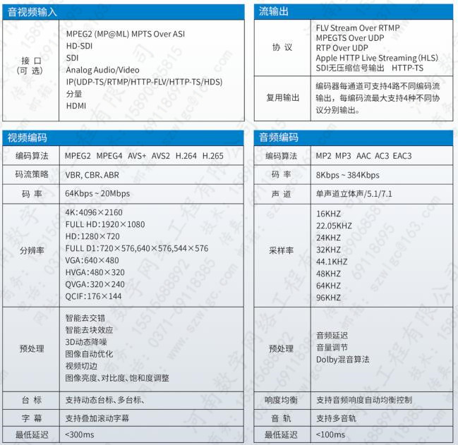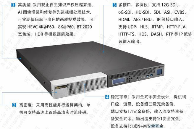 支持100路標清或25路高標清節目編轉碼;支持HEVC4K@P60、8K@P60,BT.2020寬色域HDR等較好畫質效果,支持H.264/H.265/AVS+/DRA /MPEG2/4編轉碼,支持12G-SDI, 6GSDI,HD-SDI\SDI,ASI, CVBS,HDMS, AES/EBU,IP等輸入,支持UPD,HLS,RTMP, HTT P-FLV/TS,HDS, DASH,RTP等輸出.,碼率300k-100M